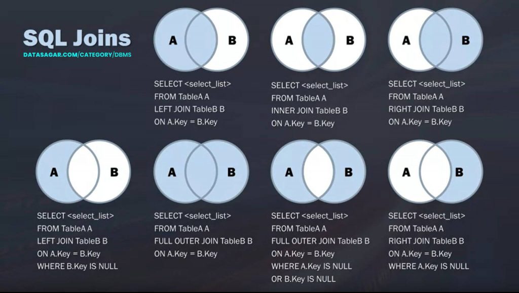 With SQL, there are various JOIN types that let you combine data from different tables. Below is a quick summary of the most popular JOIN kinds and their syntax: